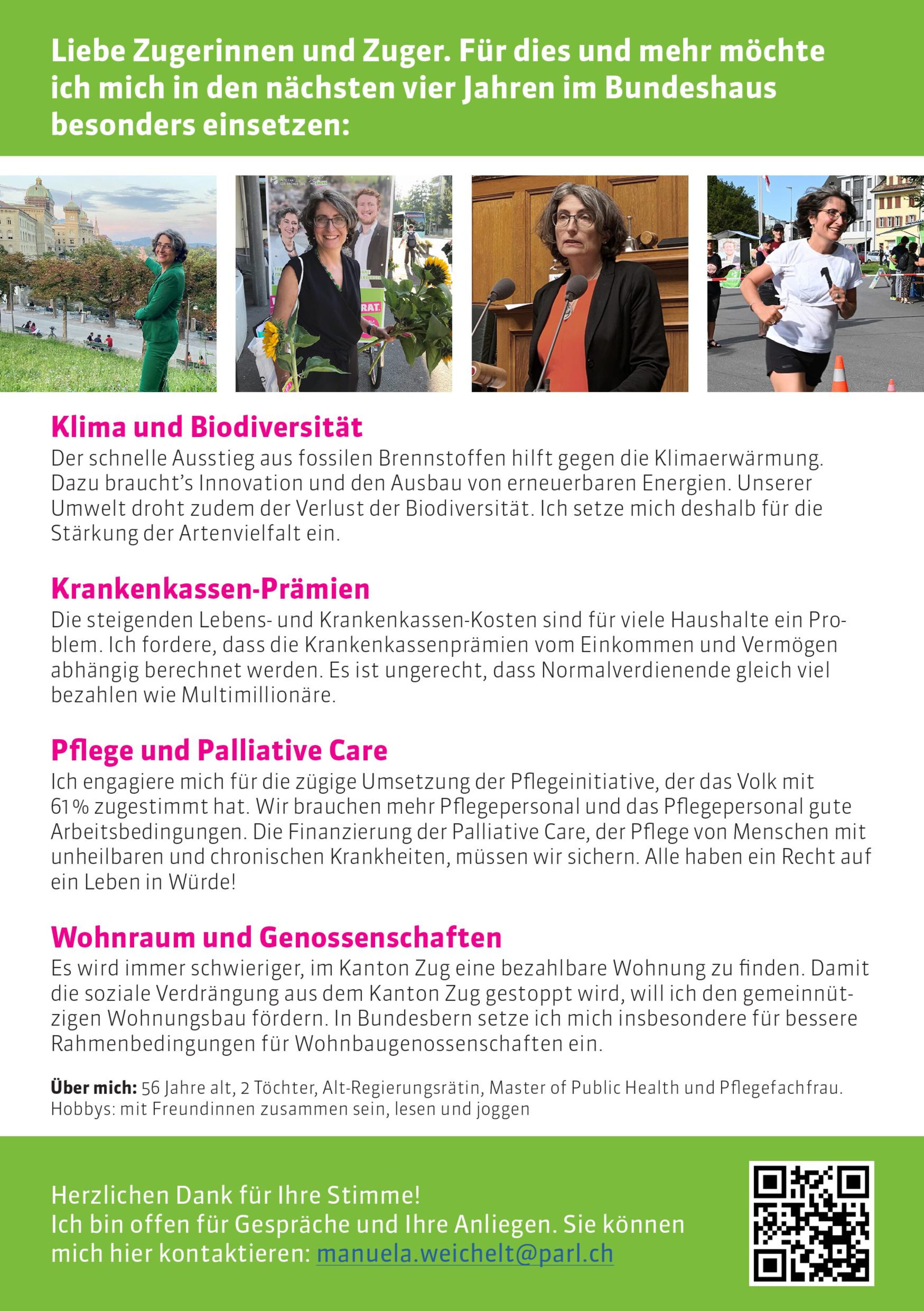 Alle kennen es – die Mühlen der Politik in der Schweiz mahlen langsam. Es braucht Zeit – meistens zu viel – um Veränderungen umzusetzen. Also ein weiterer Grund, Manuela Weichelt zu wählen: in 8 Jahren wird mehr erreicht als in 4 Jahren! Finden Sie hier raus, wofür sich Manuela Weichelt besonders einsetzt.