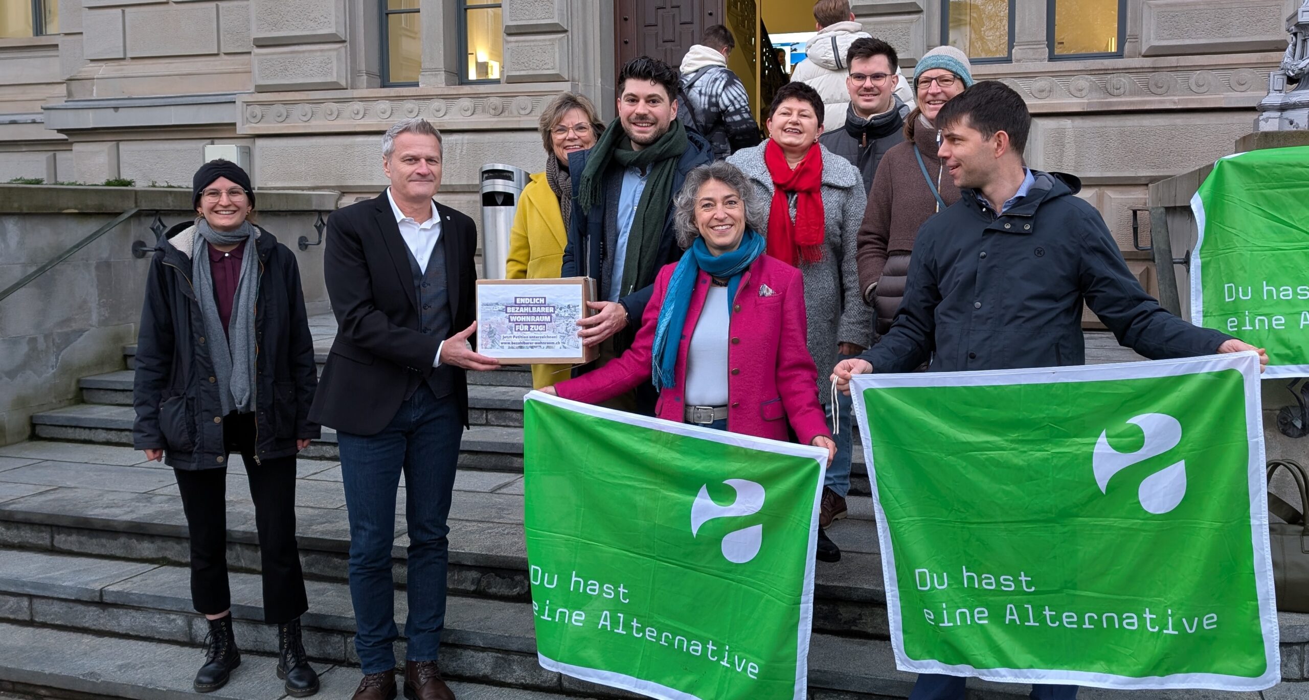 «In den letzten 10 Jahren mussten 36 000 Zuger:innen wegziehen, so kann es nicht mehr weitergehen.» betonte Luzian Franzini, Co-Präsident der Alternativen-die Grünen bei der Petitionsübergabe. Zug weist nicht nur die höchsten Durchschnittsmietpreise, sondern auch den geringsten Leerwohnungsbestand in der gesamten Schweiz auf – die Mietpreise liegen 50% über dem nationalen Durchschnitt.