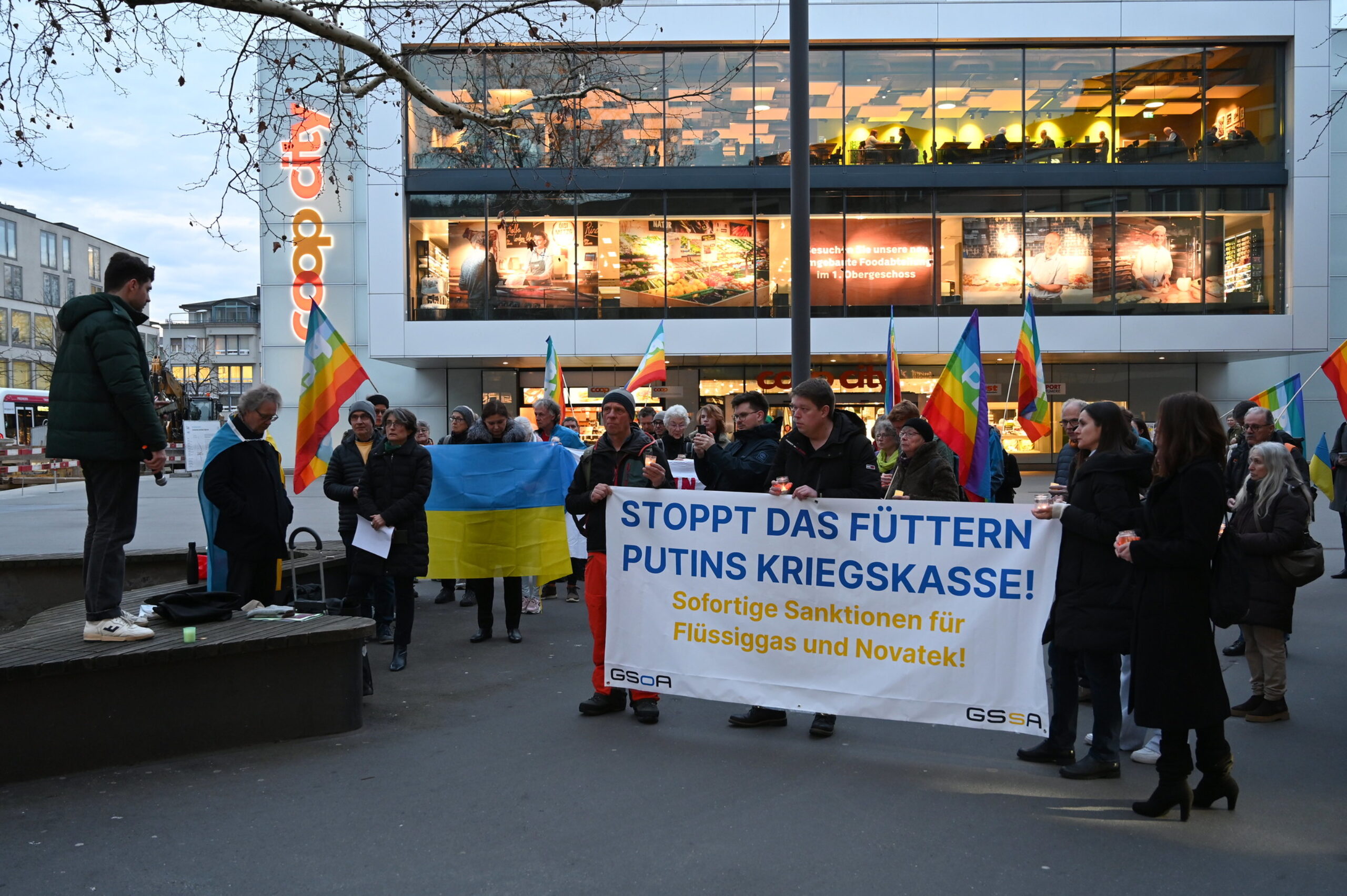 Am 3. Jahrestag des russischen Angriffskrieges versammelten sich eine stattliche Anzahl Zuger:innen auf dem Bundesplatz in Zug, um wirksame Sanktionen und eine klare Haltung der Zuger Regierung zu fordern. Noch immer wird der Krieg aus Zug mitfinanziert. In den letzten Monaten hat sich das Geschäft von Pipelines auf Flüssiggas verlagert. Wie SRF-Recherchen zeigen, spielt hierbei die Zuger Firma Novatek eine wichtige Rolle. Milliardengewinne fliessen dabei in die Kriegskassen Putins.